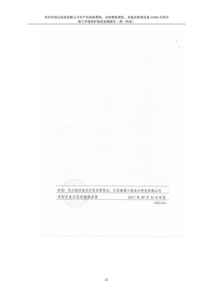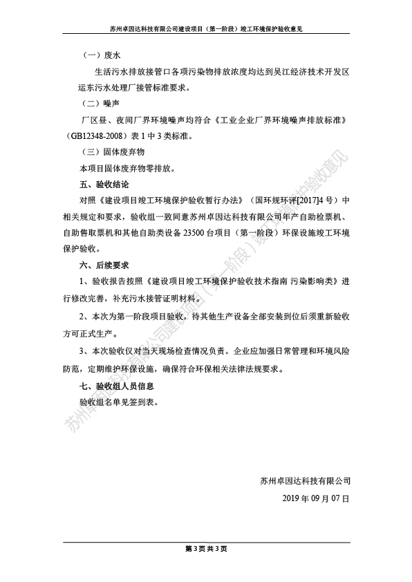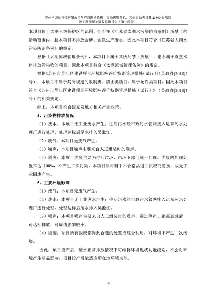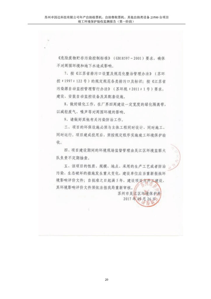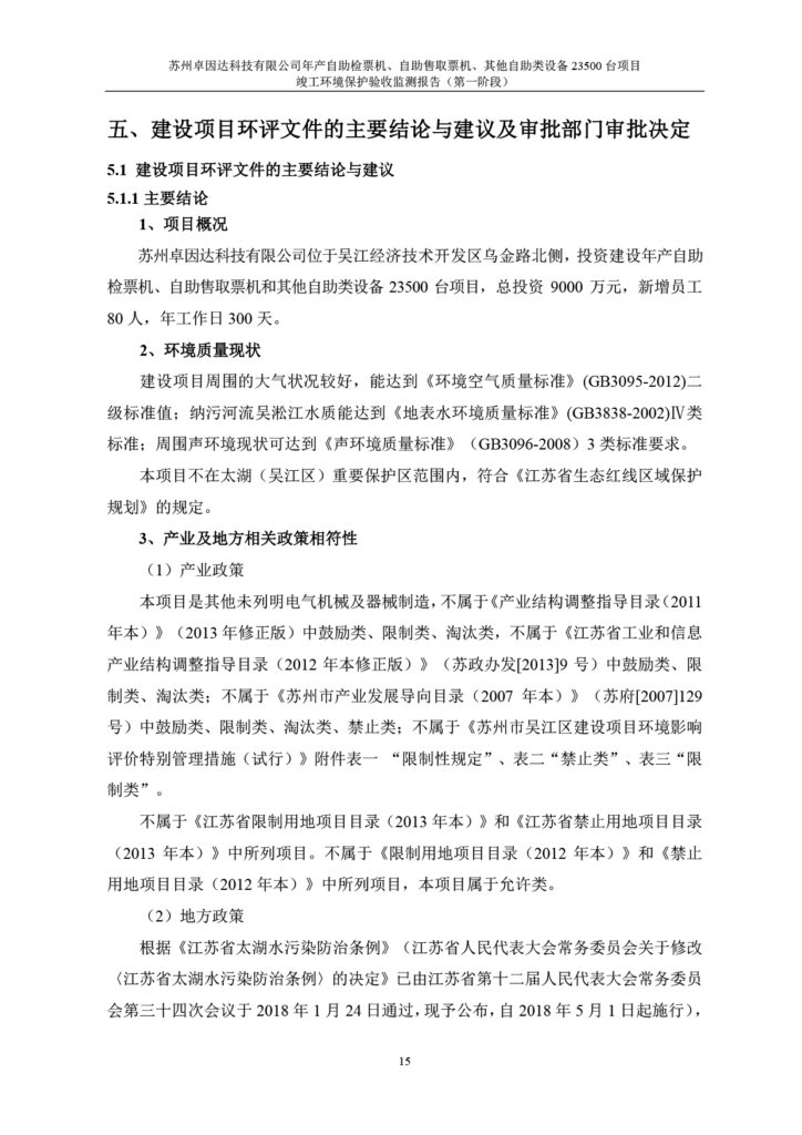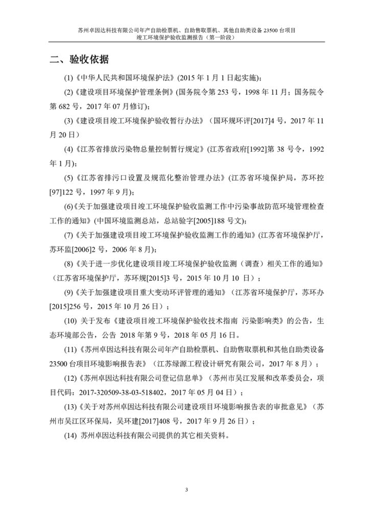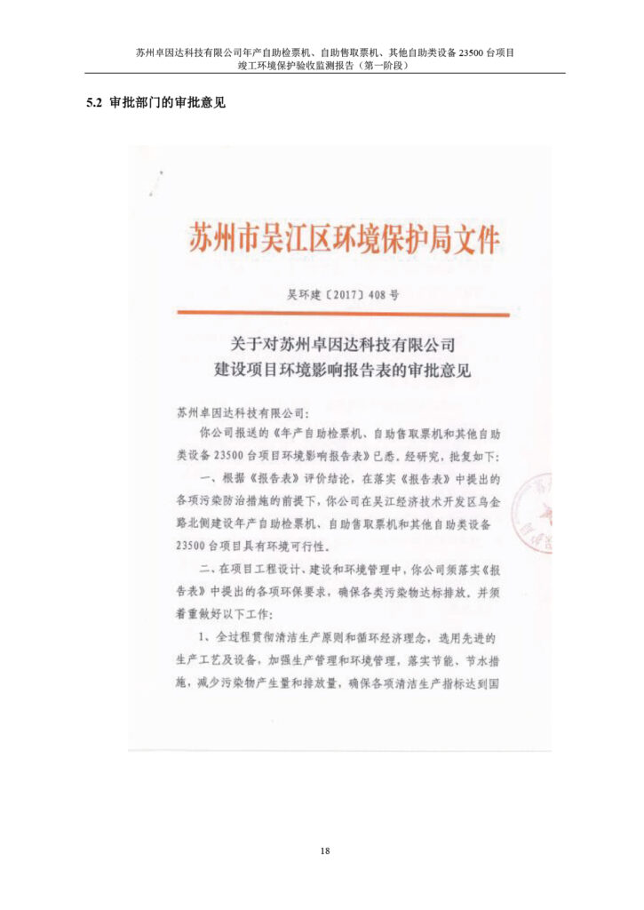 根据《国务院关于修改《建设项目竣工环境保护管理条例》的决定》,以及环保部《关于发布《建设项目竣工环境保护验收暂行办法》的公告》,现将《苏州卓因达科技有限公司年产自助检票机、自助售取票机、其他自助类设备23500 台项目竣工环境保护 验收监测报告 (第一阶段)》及验收意见公示如下: