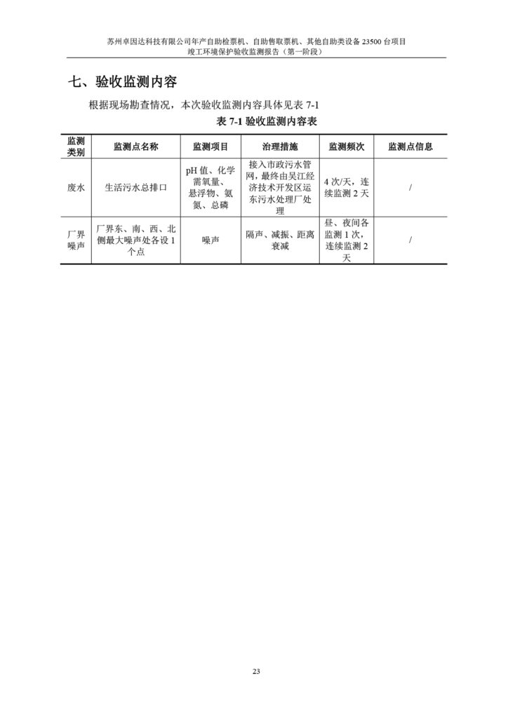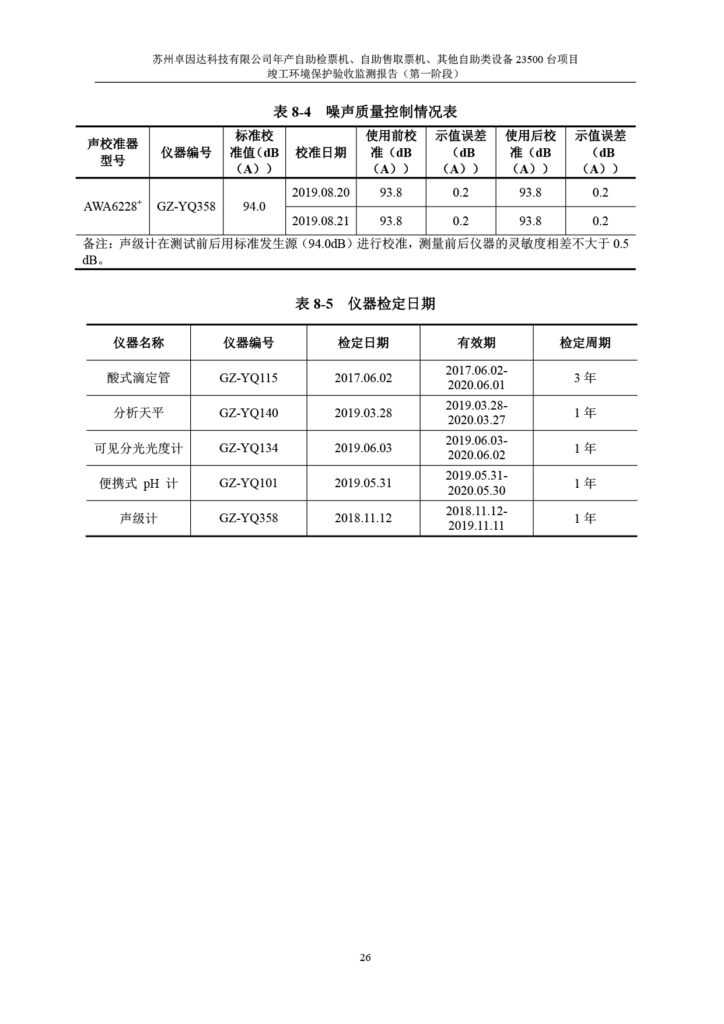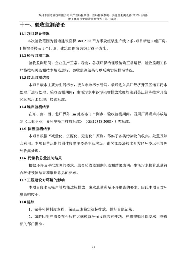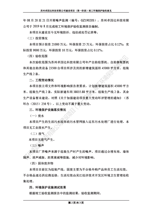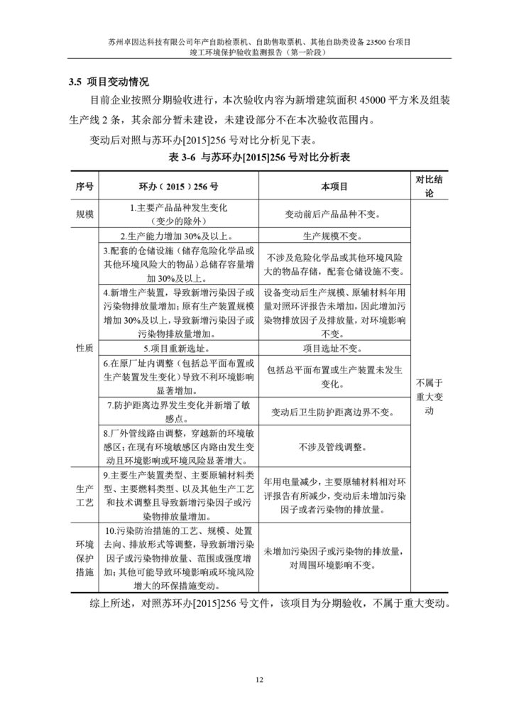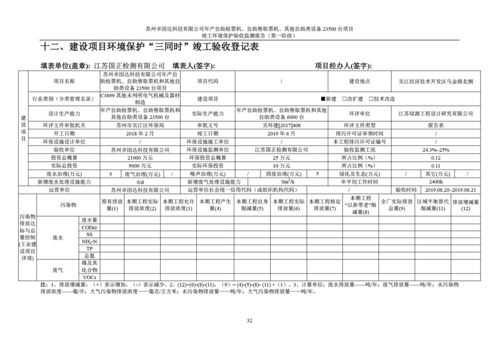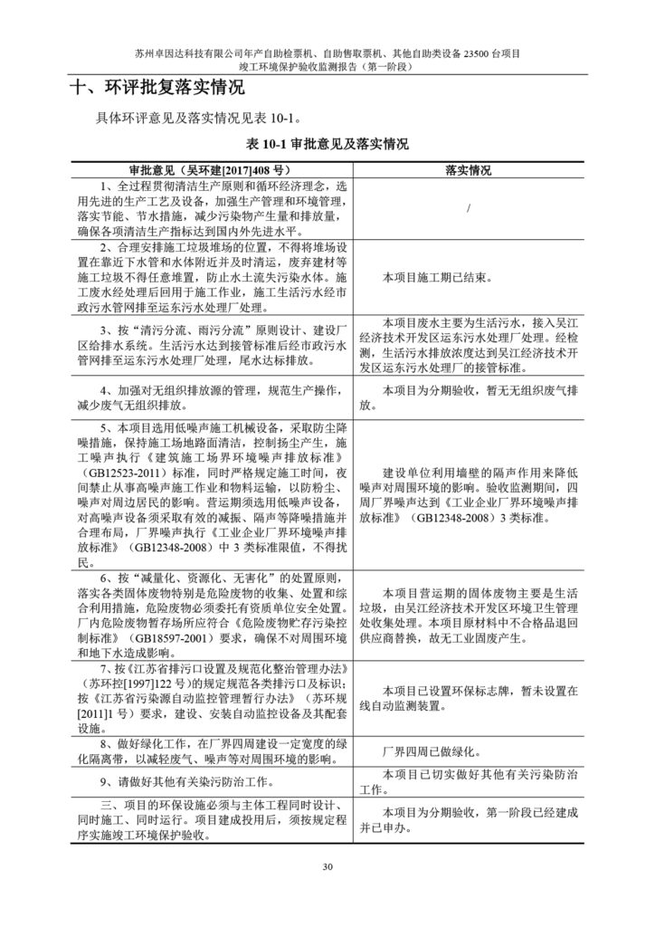 根据《国务院关于修改《建设项目竣工环境保护管理条例》的决定》,以及环保部《关于发布《建设项目竣工环境保护验收暂行办法》的公告》,现将《苏州卓因达科技有限公司年产自助检票机、自助售取票机、其他自助类设备23500 台项目竣工环境保护 验收监测报告 (第一阶段)》及验收意见公示如下:
